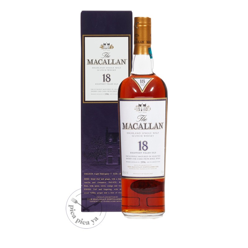 Su inquebrantable obsesión por seleccionar barricas de roble excepcionales y destilar bebidas espirituosas sublimes aporta una calidad insuperable y atemporal a The Macallan. Destilado en la destilería The Macallan en Speyside, Escocia, este legendario Single Malt se madura exclusivamente en barricas de roble de Jerez seleccionadas de Jerez, España, durante un mínimo de dieciocho años. Esto da como resultado un Single Malt satisfactoriamente rico y complejo.
